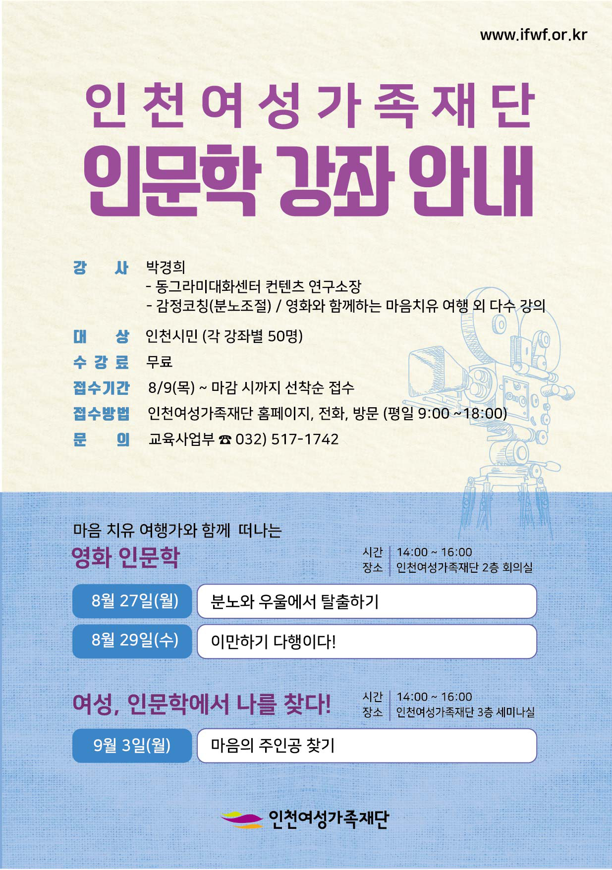 Á¢¼ö´Â ÀÎõ¿©¼º°¡Á·Àç´Ü ȨÆäÀÌÁö(www.ifwf.or.kr), ÀüÈ­, ¹æ¹®À» ÅëÇØ °¡´ÉÇÏ¸ç °­Áº° ¼±Âø¼ø 50¸íÀÌ´Ù.